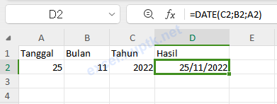 Misalkan pada cell A2 diisi tanggal 25, cell B2 diisi bulan 11 dan cell C2 diisi tahun 2022 seperti contoh berikut.