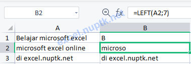 Contoh dari penerapan fungsi LEFT sehingga hasilnya tampak pada kolom B baris 1 sampai 3 pada gambar di atas, berikut penggunaan formulanya: