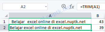Contoh dari penerapan fungsi TRIM sehingga hasilnya tampak pada kolom A baris 2 gambar di atas, 2 spasi di awal kalimat dan 2 baris di antara kata Belajar dan excel juga dihapus. Berikut penggunaan formulanya: