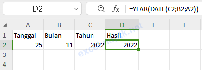 Contoh dari penerapan fungsi YEAR yang dihasilkan dari fungsi lain berupa DATE, sehingga hasilnya tampak pada kolom D baris 2 gambar di atas. Berikut penggunaan formulanya: